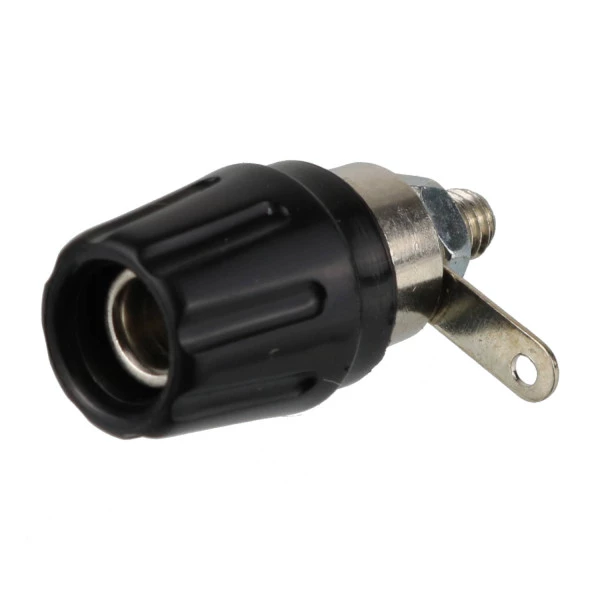 O borne B19C é ideal para fixação em painel, inclusive metálico, pois seu corpo plástico isola a parte metálica do painel. Possui o diâmetro de 4mm, que é o diâmetro de pino banana mais popular. No B19C é possível fixar diretamente um fio lateralmente, pois ele possui um furo lateral.