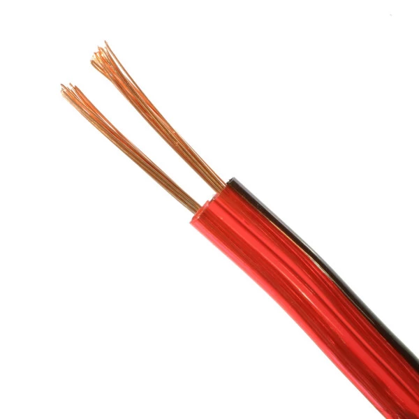 O cabo vermelho duplo com listra preta é ideal para conexão de alto falantes, e possui a listra para polarização.