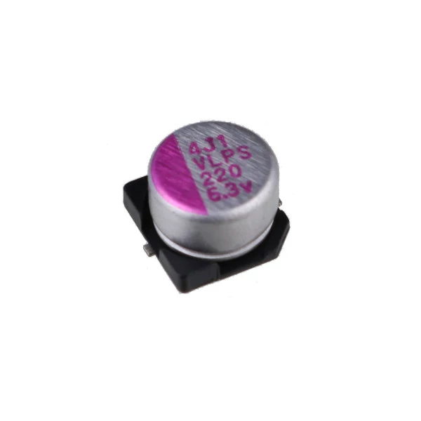 Este modelo é para a montagem em superfície (SMD), possuindo 220uF de capacitância e 6,3V de tensão máxima