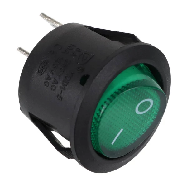 Chave gangorra liga/desliga fabricada em material plástico, com dois terminais, contatos NA (normalmente aberto).