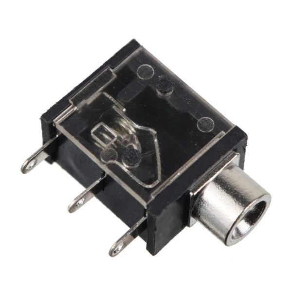 Jack J2, mono, para montagem em placa de circuito impresso. Possui 3 pinos, chamado circuito fechado, que é o recurso que corta o áudio das caixas de som quando é inserido o plug no conector.