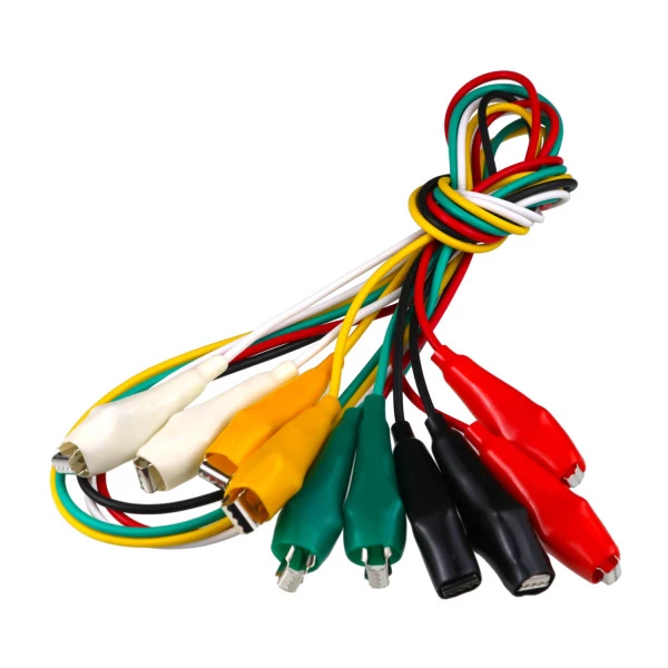 Kit contendo 5 cabos jacaré x jacaré, com um amarelo, um branco, um preto, um verde e um vermelho. Cada cabo mede 1 metro, o que fazem desse kit ideal para a realização de testes em bancadas e conexão em pequenas baterias, podendo ser conectado e desconectado rapidamente nos mais diversos circuitos, peças e componentes.