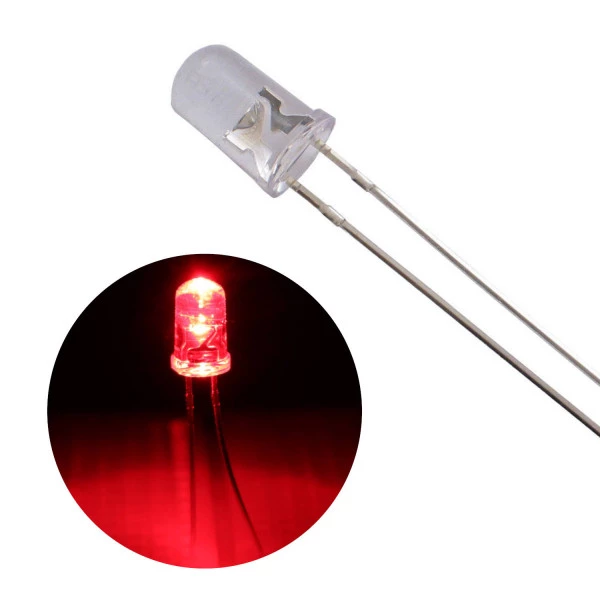 Esse LED tem 5mm de diâmetro, com o corpo transparente e acende na cor vermelha.