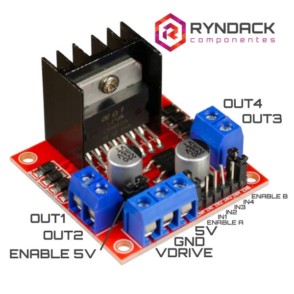 Esse módulo de ponte H, usa o circuito integrado L298N, que é um circuito consagrado na eletrônica para essa função. Ele possui duas pontes H completas, permitindo o controle de dois motores com apenas um módulo, sendo muito útil na construção de pequenos robôs.
