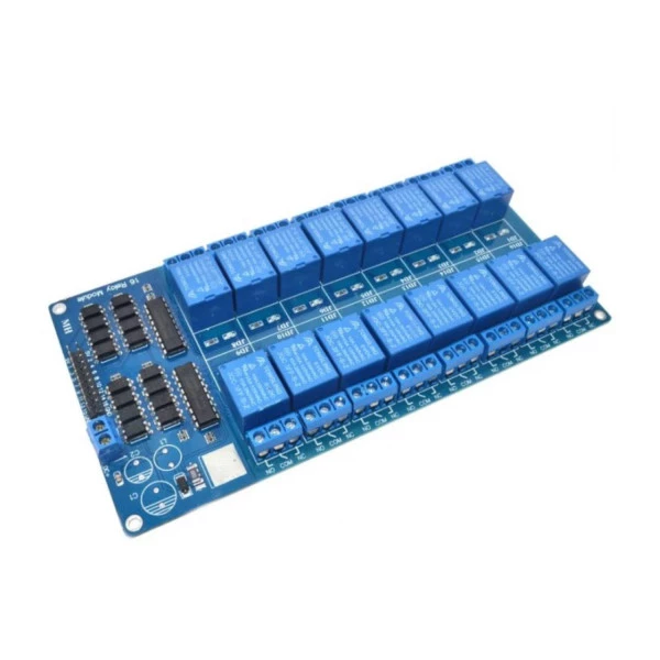 Esse módulo possui dezesseis relês, e todo o circuito para o acionamento deles, podendo ser conectado diretamente às portas de saída do microcontrolador. Ele também possui dezesseis LEDs indicativos, que indicam se os relês estão acionados. Com os relês desse módulo você pode fazer acionamento de diversos tipos de carga, tais como lâmpadas, motores, equipamentos elétricos em geral.