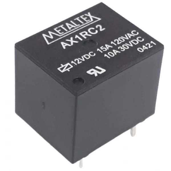 O AX1RC2 é um relé da Metaltex, conhecido por sua qualidade, e possui uma tensão de bobina de 12V e uma corrente máxima do contato de 15A.