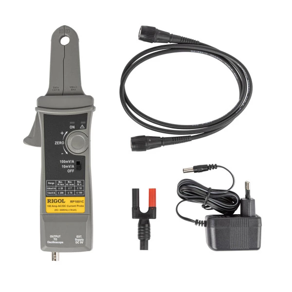 A ponta de corrente RP1001C para osciloscópios é capaz de medir corrente de ate 100A de pico em condutores de até 11mm. Essa ponte pode ser usado tanto em corrente alternada (AC) quanto em corrente continua (DC). Essa ponta também pode ser usada com um multímetro, bastando realizar a conexão por meio de um adaptador BNC X Banana.