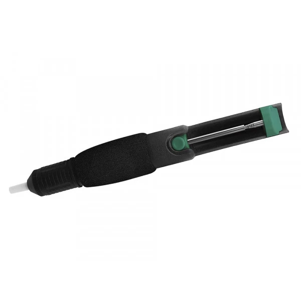 O funcionamento do sugador de solda é muito simples, ele gera vácuo e suga a solda derretida, desfazendo a conexão.